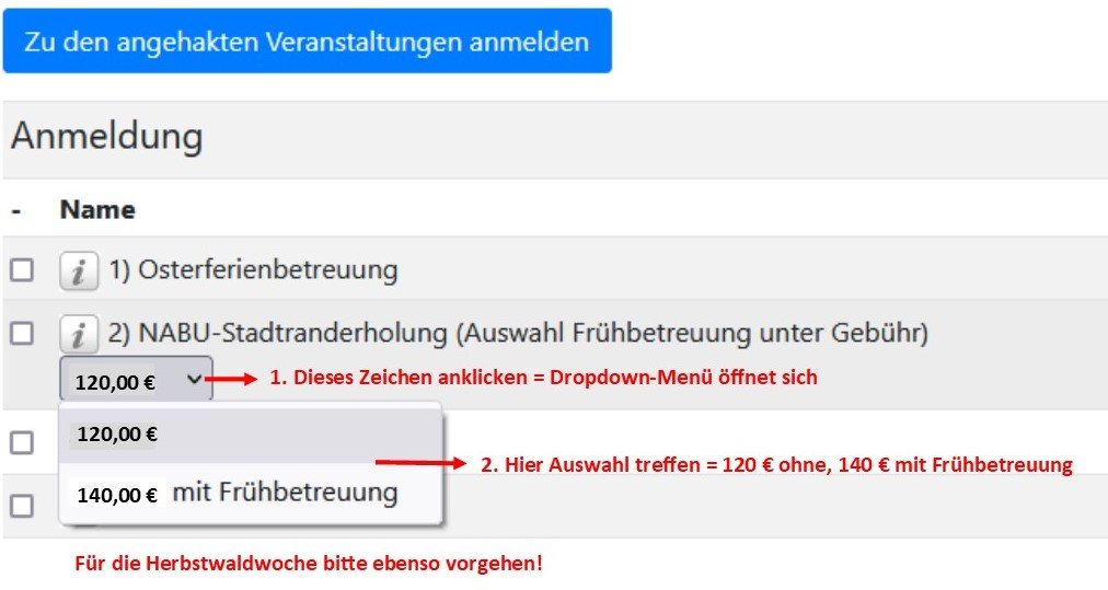 BITTE BEACHTEN: bei den NABU-Angeboten muss unter der Rubrik "Gebühr" die Auswahl "ohne/mit Frühbetreuung" getroffen werden! Anleitung: