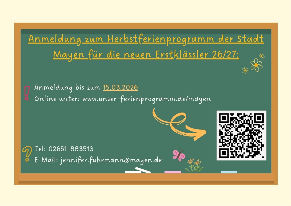 auch in diesem Jahr bieten wir, das Team der Jugendpflege des Stadtjugendamtes in Mayen, wieder spannende Ferienprogramme in den Oster-, Sommer- und Herbstferien für Kinder aus Mayen (inkl. Stadtteile) im Alter von 6 bis 12 Jahren an. Die Anmeldung ist ab jetzt, bis zum 05. März 2026 möglich. Es werden alle Anmeldungen aufgenommen und anschließend ausgelost.